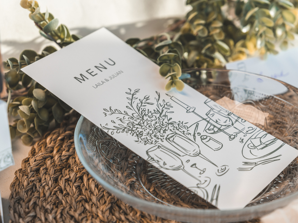 Afin de présenter le repas à vos invités, réalisez votre menu personnalisé sur Tadaaz. À peine installés à votre table de mariage, tous vos proches auront déjà l’eau à la bouche !